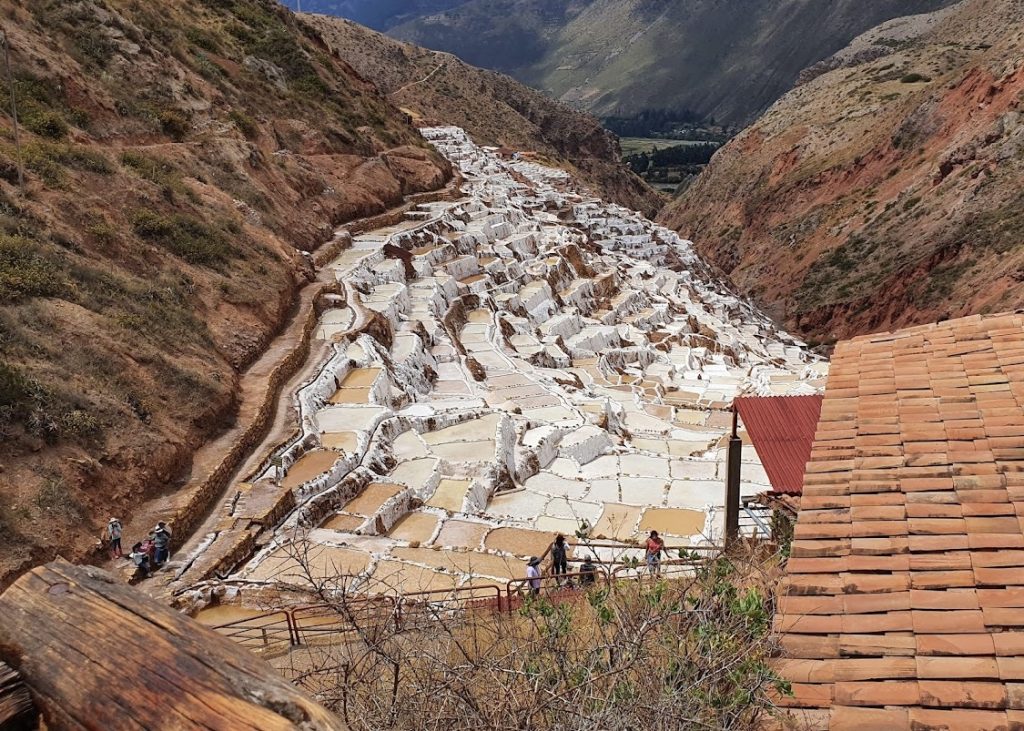 インカ時代以前から、塩はマラスでは、地元の地下水流から塩水を蒸発させることによって得られました。塩分濃度の高い水は、地下水路の泉から自然に湧き出ています。水の流れは数百の段々になった池に徐々に流れ落ちるように構築された小さな水路の複雑なシステムに向けられます。ほとんどすべての池は面積が 4 メートル四方未満で、深さが 30 センチを超える池はありません。すべてが必然的に多角形に形作られ、水の流れは労働者によって制御、監視されます。